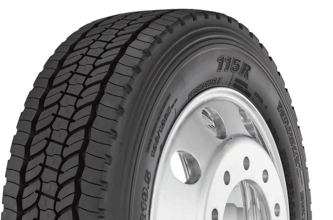 • Non seulement permet-elle de limiter le coût d’exploitation au kilomètre lors d’applications à haute usure abrasive, mais la semelle à cinq nervures (avec épaulement semi-arrondi) réduit également les risques de déchirures ou de lacérations de l’épaulement. Avec un rendement et une adhérence améliorés la semelle procure une excellente stabilité latérale et capacité d’évacuation d’eau.