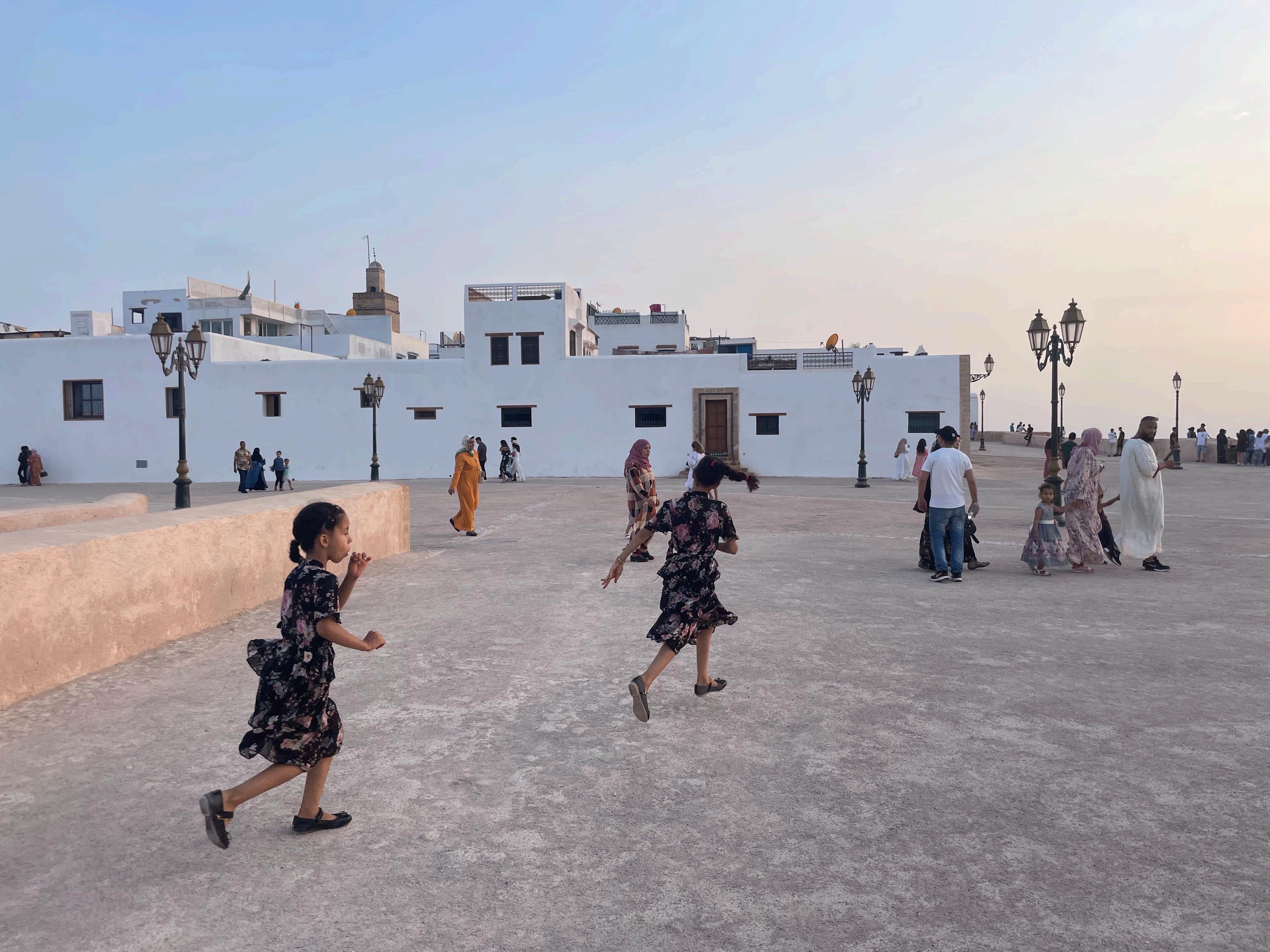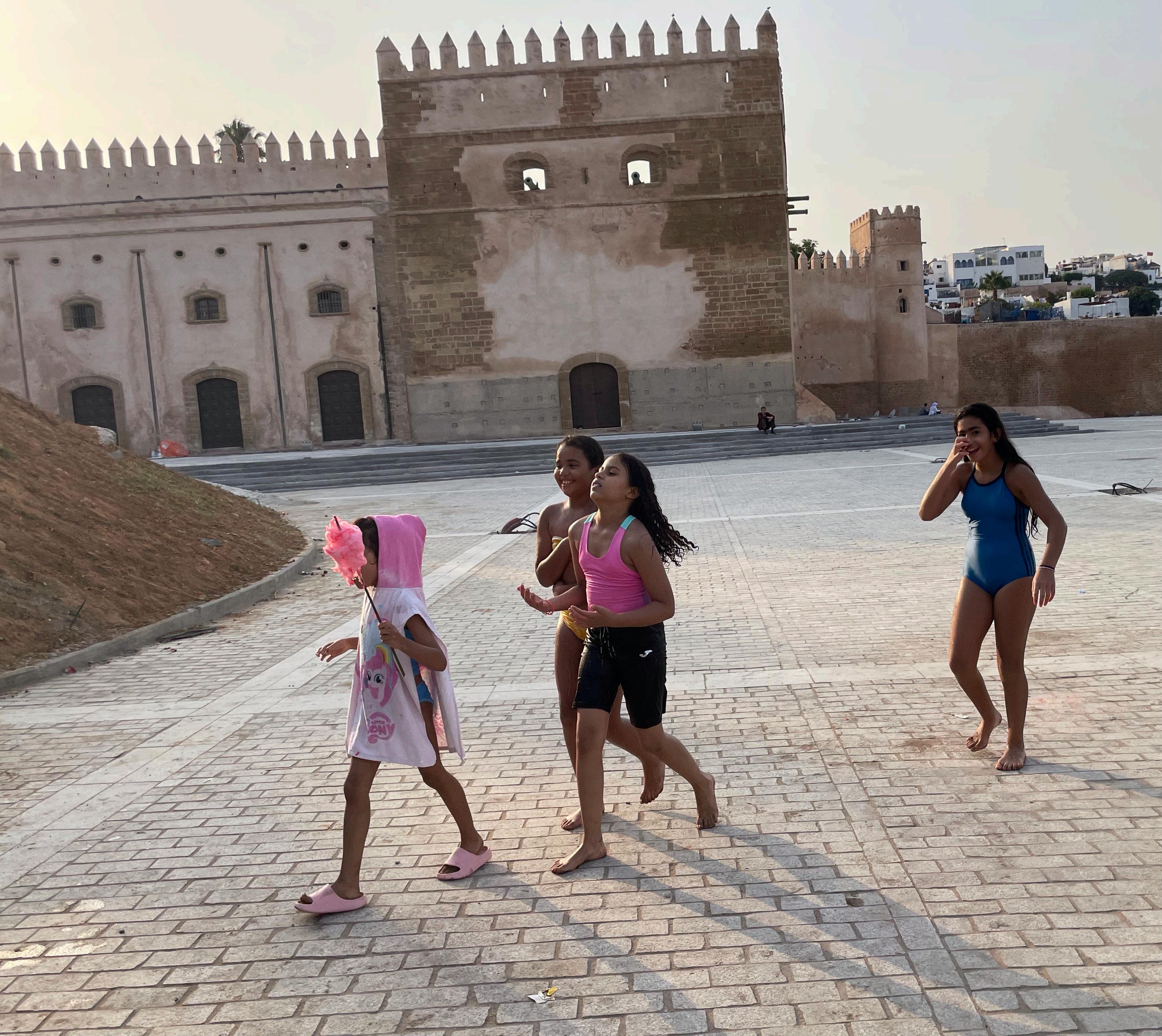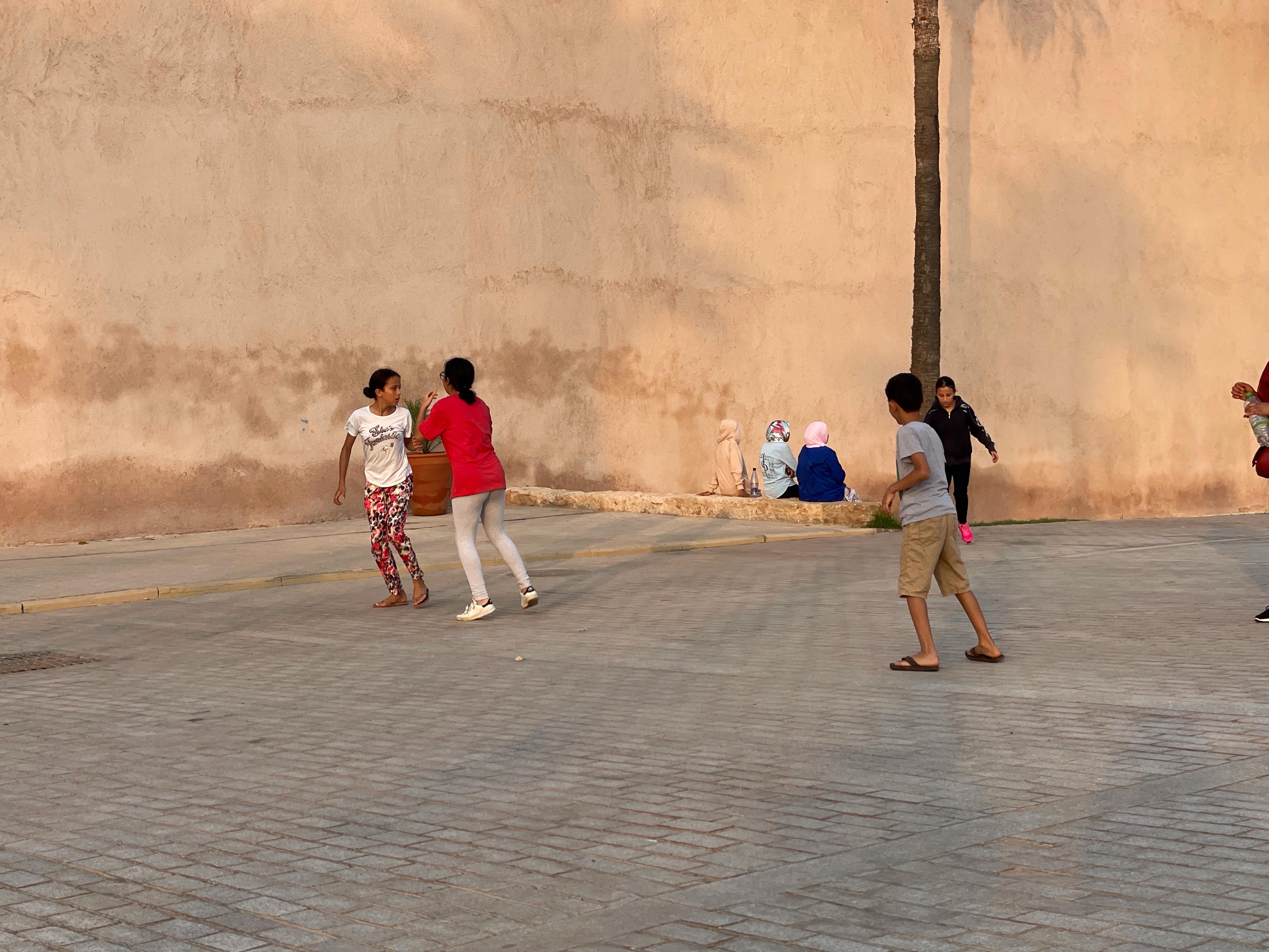 Typically it is boys who take on public space playing football. These girls were just as brave as the Spanish female soccer team and they took on the square in front of the Kasbah. They were also inclusive and allowed a boy to join. Will they keep on playing in a couple of years as teenagers? They do have their role models, so let’s hope they don’t give up.