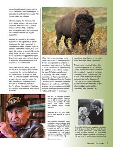 (top left) In February, Simpson was part of a productive visioning time in DC for making plans to increase the number of North Dakota and South Dakota *BIE National Board Certified Teachers. (lower left) A young Lakota shawl dancer takes a break at a 2013 powwow. (left) Simpson interviewed many tribal elders, including David Bald Eagle, Lakota chief and Chief of the National Indigenous People Coalition, for the OCEU project. You can watch recordings of all of the interviews with tribal leaders and learn more about the OCEU at www.wolakotaproject.org.
