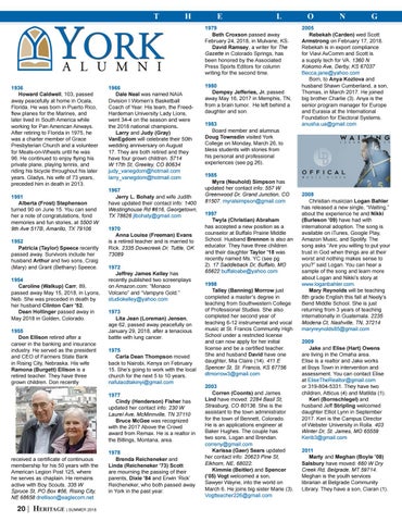 1966 Dale Neal was named NAIA Division I Women’s Basketball Coach of Year. His team, the FreedHardeman University Lady Lions, went 34-4 on the season and were the 2018 national champions. Larry and Judy (Gray) VanEgdom will celebrate their 50th wedding anniversary on August 17. They are both retired and they have four grown children. 5714 W 17th St, Greeley, CO 80634 judy_vanegdom@hotmail.com larry_vanegdom@hotmail.com 1967 Jerry L. Bohaty and wife Judith have updated their contact info: 1400 Westinghouse Rd #616, Georgetown, TX 78626 jlbohaty@gmail.com 1970 Anna Louise (Freeman) Evans is a retired teacher and is married to Rick. 2335 Dovecreek Dr, Tuttle, OK 73089 1972 Jeffrey James Kelley has recently published two screenplays on Amazon.com: “Monaco Volcano” and “Vampyre Gold.” studiokelley@yahoo.com 1973 Lita Jean (Loreman) Jensen, age 62, passed away peacefully on January 29, 2018, after a tenacious battle with lung cancer. 1975 Carla Dean Thompson moved back to Nairobi, Kenya on February 15. She’s going to work with the local church for the next 5 to 10 years. nafulacdtakinyi@gmail.com 1977 Cindy (Henderson) Fisher has updated her contact info: 230 W Laurel Ave, McMinnville, TN 37110 Bruce McGee was recognized with the 2017 Above the Crowd award from Remax. He is a realtor in the Billings, Montana, area.