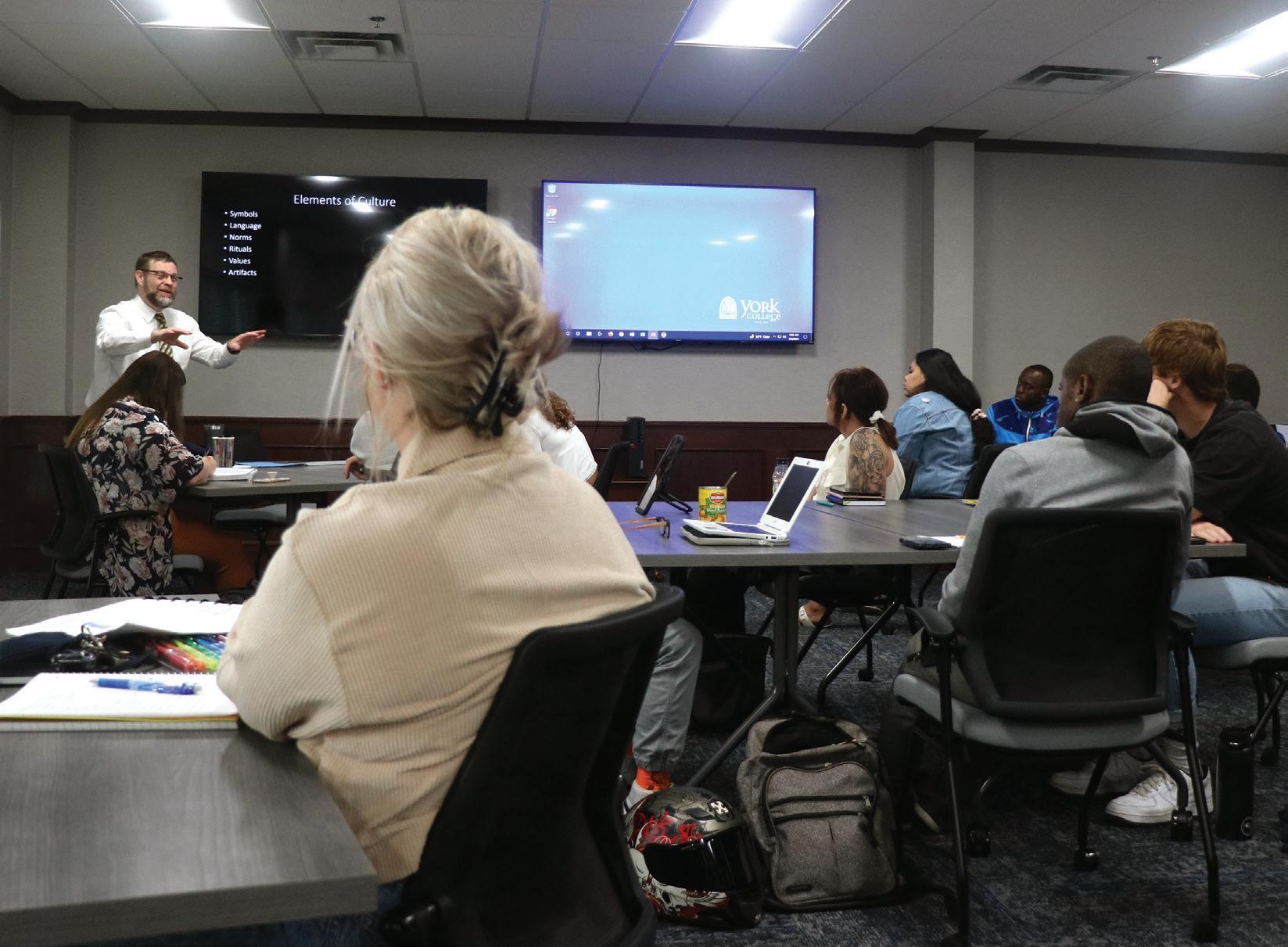 Twenty-one York College students have the best of both worlds starting this fall 2021 term. These "hybrid" students are enrolled in the Master of Arts in Organizational and Global Leadership program and are enjoying the benefits of taking classes that are in-person as well as online. They complete most assignments and readings in a structured but self-paced virtual setting. Then they meet face-to-face, twice a week, with Dr. Shane Mountjoy in a classroom format to engage in the traditional on-campus setting.