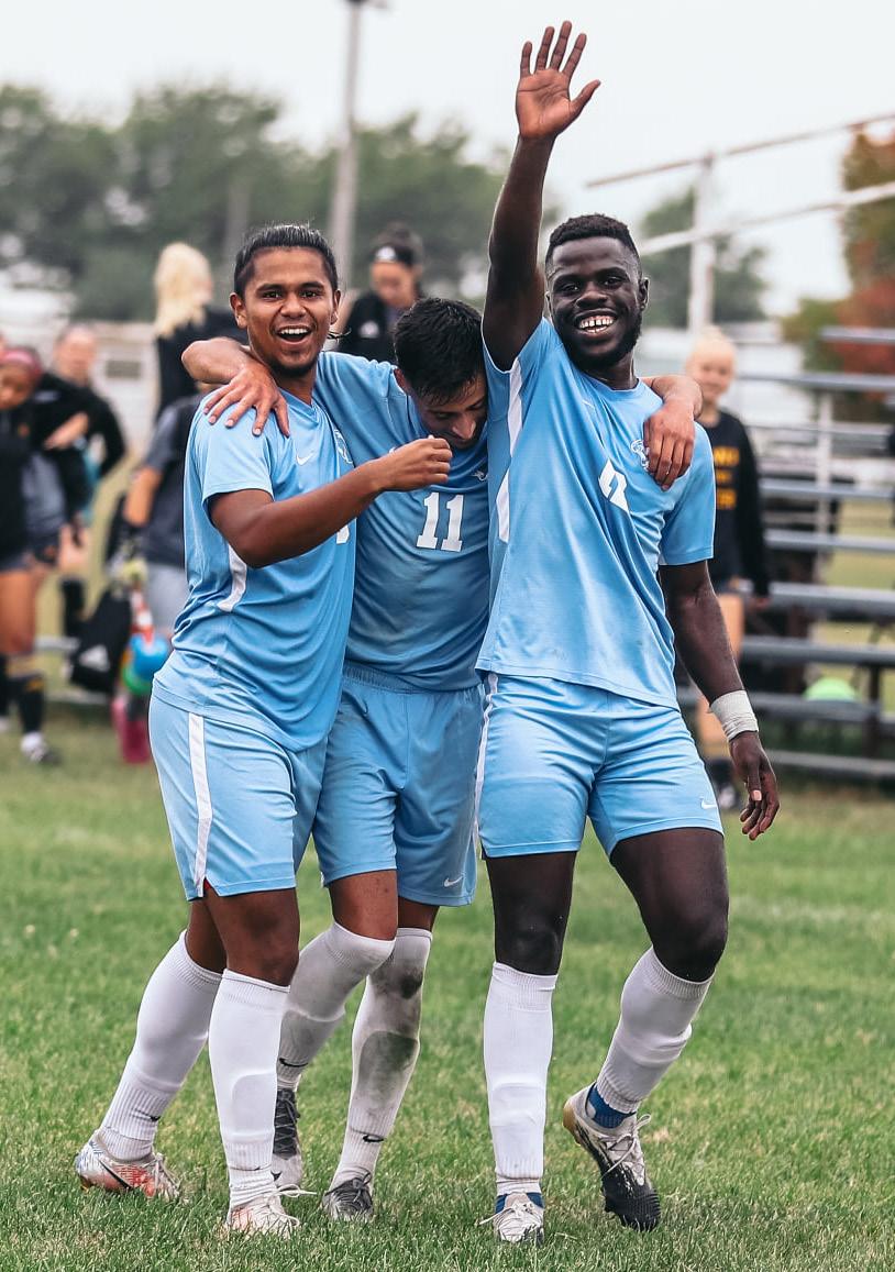 (below) Archford Manduvi is congratulated on his goal in the 90th minute against Ottawa University by Johan Rodriguez and Jose Calderon. (above) York College's certified athletic trainer Chad Karcher has seen YC athletics grow from around 150 student-athletes in 1999 to more than 350 in 2021.