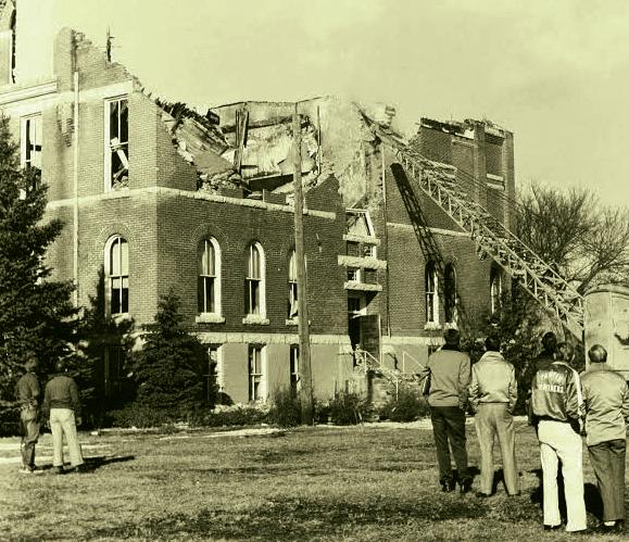 Then, at the mid-point of the 20th century, a redirection for York College. Venerable Old Main burned, leaving among its ashes the dreams of the United Brethren. The fire began in an upper portion of the building’s west side, perhaps due to some faulty wiring. The January 3rd fire occurred on a freezing night, and firefighters were plagued by low water pressure. After the fire, residents of York gave assistance, including York Public Schools and St. Joseph’s School. The president of Hastings College offered the loan of a number of classroom chairs. The York Daily NewsTimes reported the story with the following lead on January 4: “The fire charred skeleton of the York College Administration Building today stood in evidence of a scorching conflagration which last night destroyed the nerve center of the Evangelical United Brethren school.”