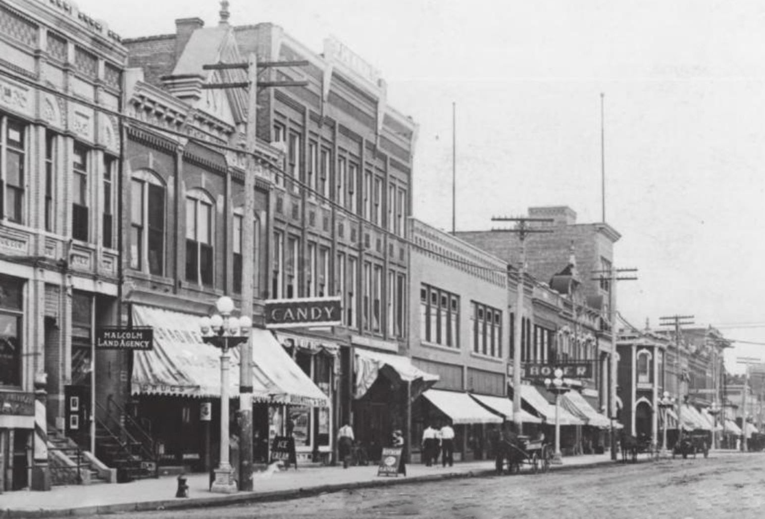 (left) Classes in 1890-91 were held on the second floor of the structure where three men in white shirts are standing, the site of Cobbs Dry Goods, in the Wirt Building located on the west side of the town square.