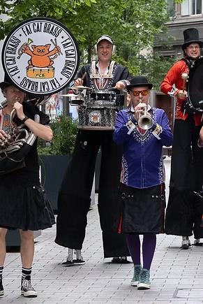 Fat Cat Brass is a high-energy UK brass band known for funky pop covers and a unique twist drummers on stilts! Their lively performances blend music and spectacle, making them a hit at weddings, festivals, parades, and street events.