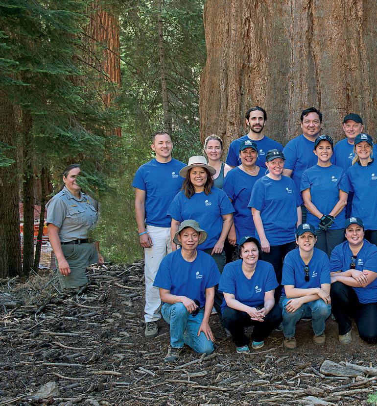 CENTER Capital Group employees have volunteered their time to restore and protect habitat throughout Yosemite, including in Mariposa Grove, where they played an important role in ensuring the long-term health of the giant sequoias. ABOVE Capital Group has supported major projects throughout the park, including the landmark restoration of the area around Lower Yosemite Fall.