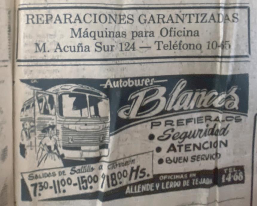 Anuncio publicado en la página 3A del periódico El Sol del Norte de nuestra hermosa ciudad de Saltillo el domingo 2 de diciembre de 1954.