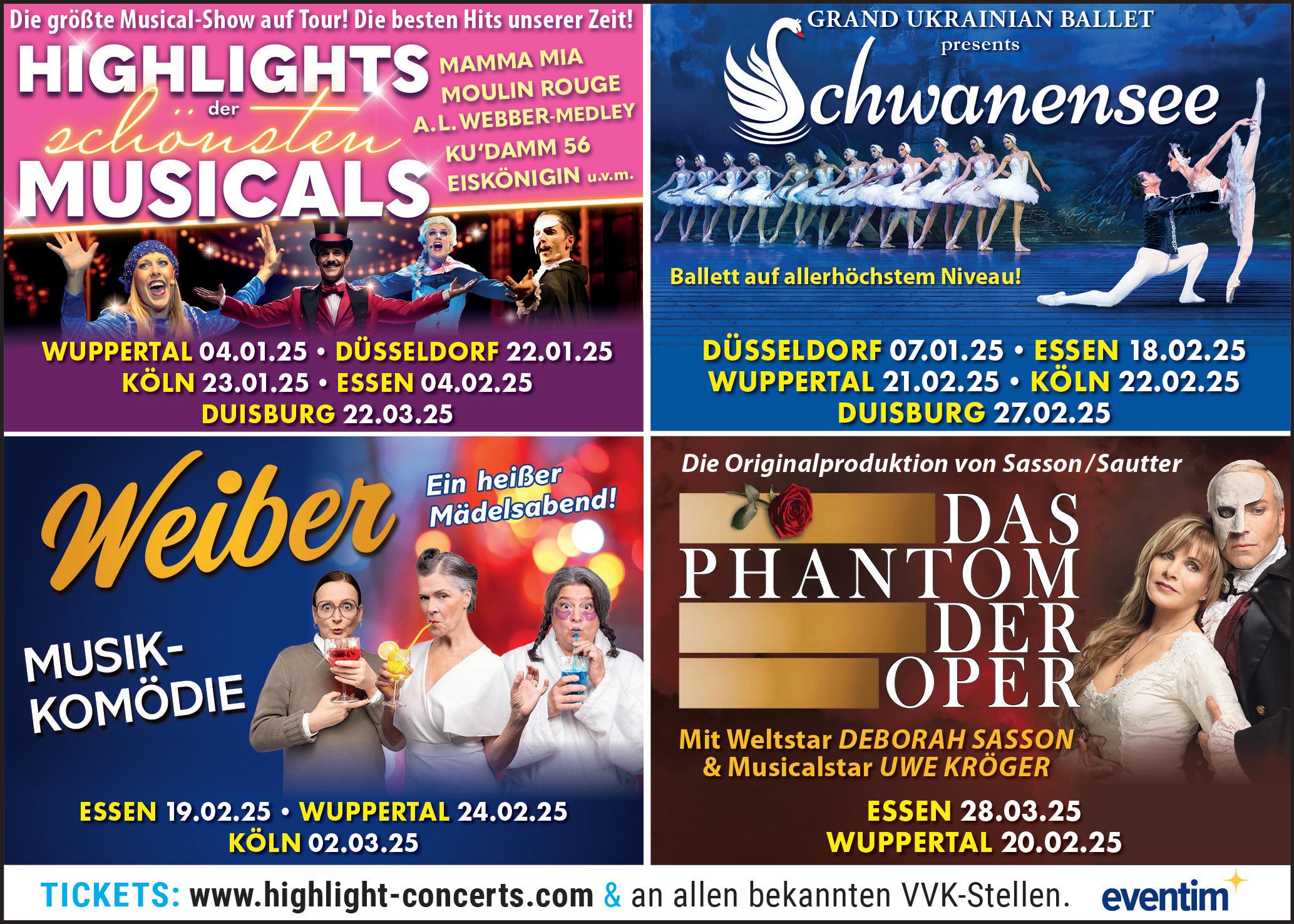 „Highlights der schönsten Musicals“ ist nicht nur eine Show für Musical-Liebhaber, sondern auch für diejenigen, die die Faszination dieser Kunstform zum ersten Mal erleben möchten. Die Tournee besucht Wuppertal, Düsseldorf, Köln, Essen & Duisburg. Die Vorbereitungen laufen auf Hochtouren, damit jeder Auftritt ein tolles Erlebnis wird.