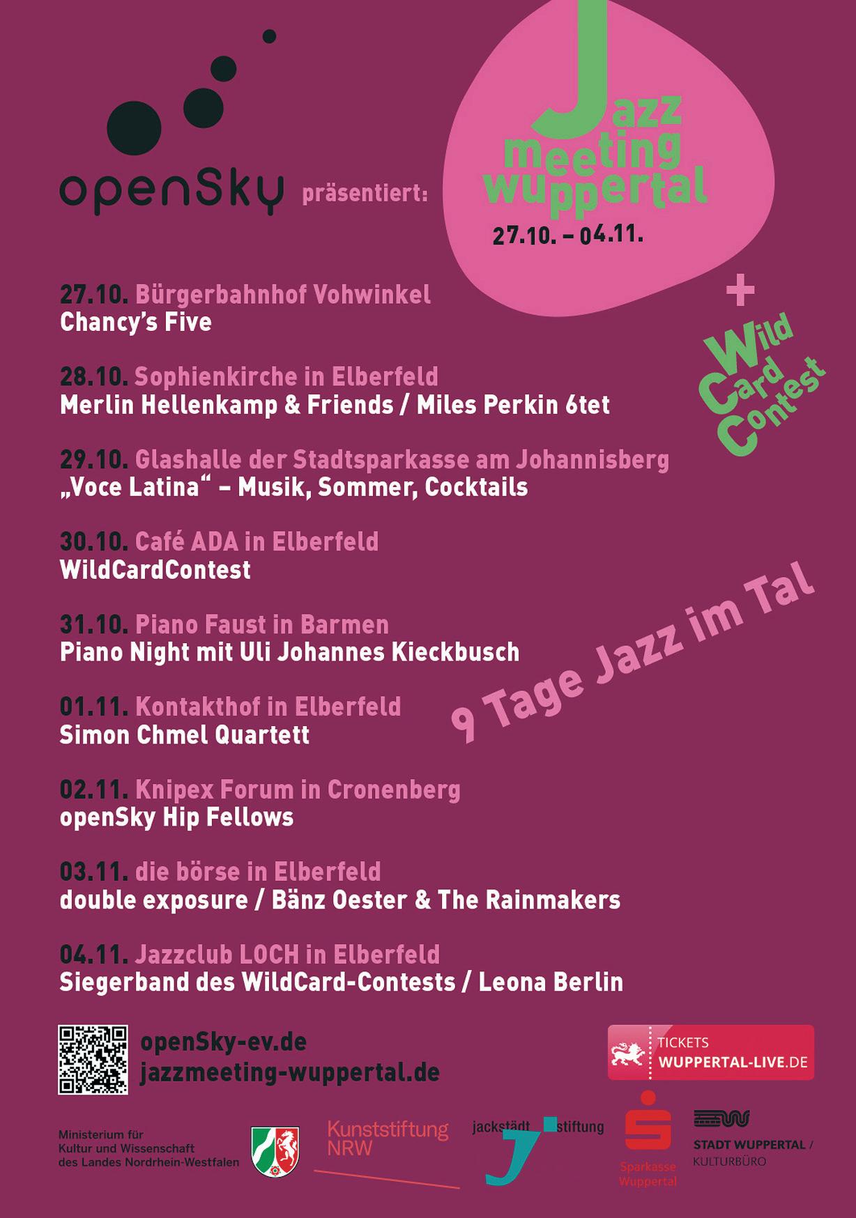 Das JazzMeeting Wuppertal, das sich längst einen guten Ruf als ‚EntdeckerFestival‘ erarbeitet hat, geht in die 19. Runde und findet vom 27. Oktober bis 4. November als 9-tägiges Festival an diversen Spielorten statt. ‚OpenSky e.V.‘, der seit Jahren das JazzMeeting organisiert, konnte wieder viele JazzVeranstalter im Tal für das Konzept gewinnen.