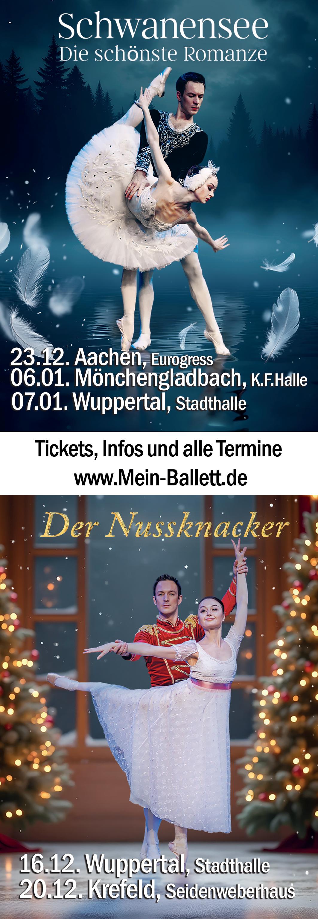 Die Zuschauer erleben die dramatische Liebestragödie um die verfluchte Prinzessin Odette, den verliebten Prinzen Siegfried sowie die düstere Verführung durch Odile in einer berührenden Choreografie. Das Crown Ballet präsentiert die beiden Tanzklassiker mit einem Live-Orchester als Gastspiele in unserer Region. Termine von 'Der Nussknacker': 16.12.25, Wuppertal, Stadthalle – 20.12.25, Krefeld, Seidenweberhaus. Termine von 'Schwanensee': 23.12.25, Aachen, Eurogress – 6.1.26, Mönchengladbach, Kaiser-FriedrichHalle - 7.1.26, Wuppertal, Stadthalle. Infos und Tickets unter mein-ballett. de. Foto: Joe Nobile [MN]
