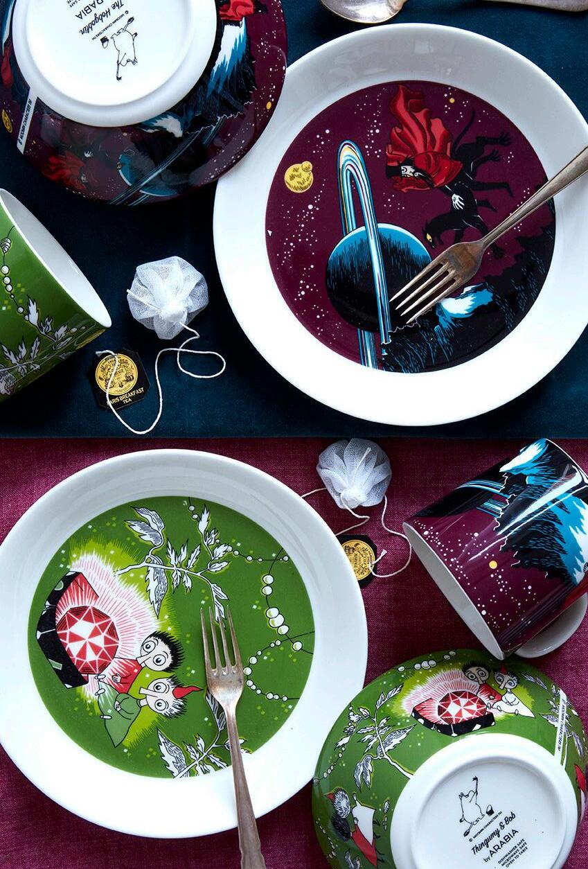 Illustratør Tove Slotte har tegnet Mummimotivene på Arabias keramikkprodukter. Med utgangspunkt i Tove Janssons historier og originale svart/hvitt illustrasjoner, har hun tilpasset motiven og fargene til keramikkens form og karakterenes personlighet og temperament på over 100 ulike kopper.