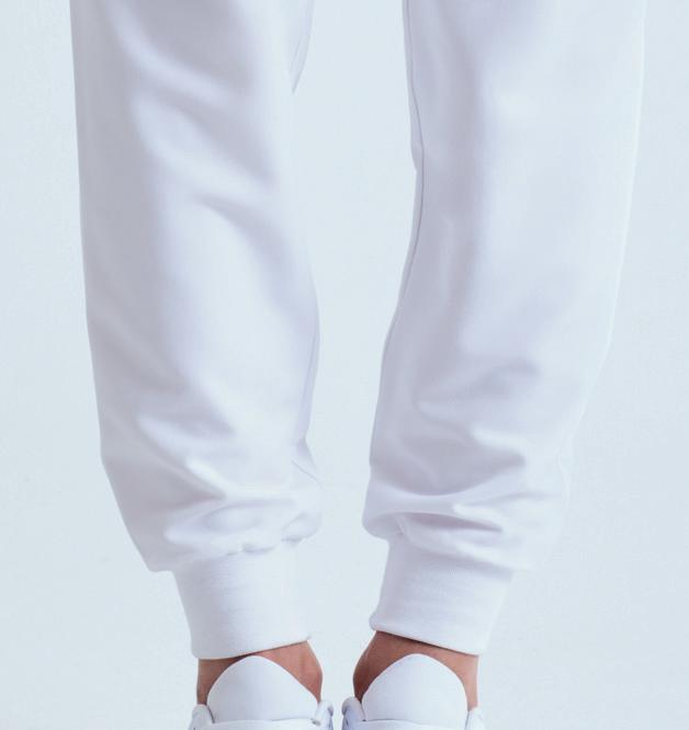 Kvalitet: 44% polyester, 33% resirkulert polyester, 19% viskose, 6% elastan, 210 gsm (Hvit) 47% polyester, 33% resirkulert polyester, 15% viskose, 5% elastan, 240 gsm