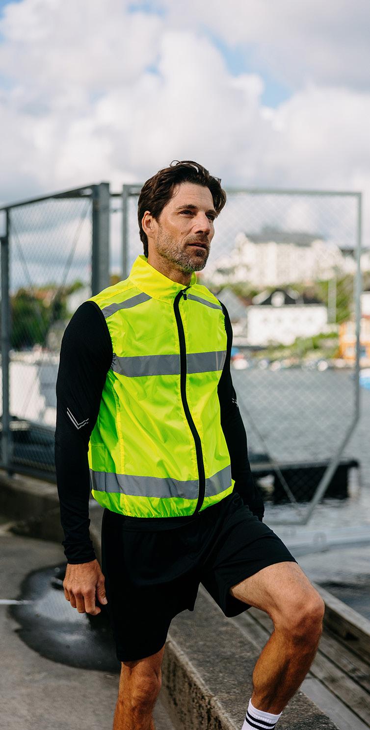 Unisex træningsvest med påsyede reflekser i taljen. Let faconsyet. Praktisk sidelomme med lynlåslukning. Lynlås på front. Meshpanel i siderne for ventilation.