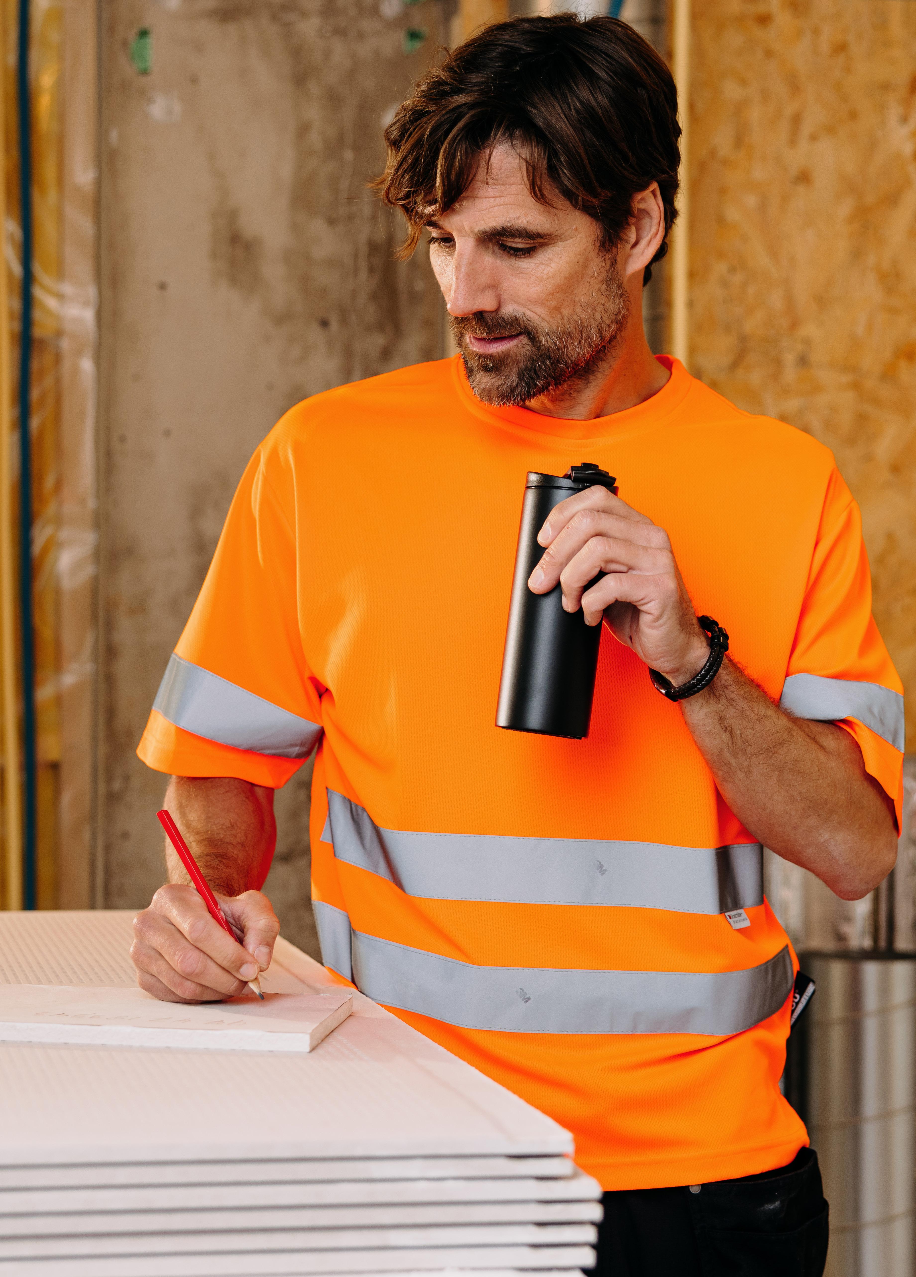 Pro-Dry behandlet unisex t-shirt. Pustende og fukttransporterende stoff gjør den perfekt til aktivitet. Ekstra refleksfelt på skuldre og rundt ermer. Kontrastafarget rib på hals, mansjetter og linning. CE-merket EN 20471, klasse 2.