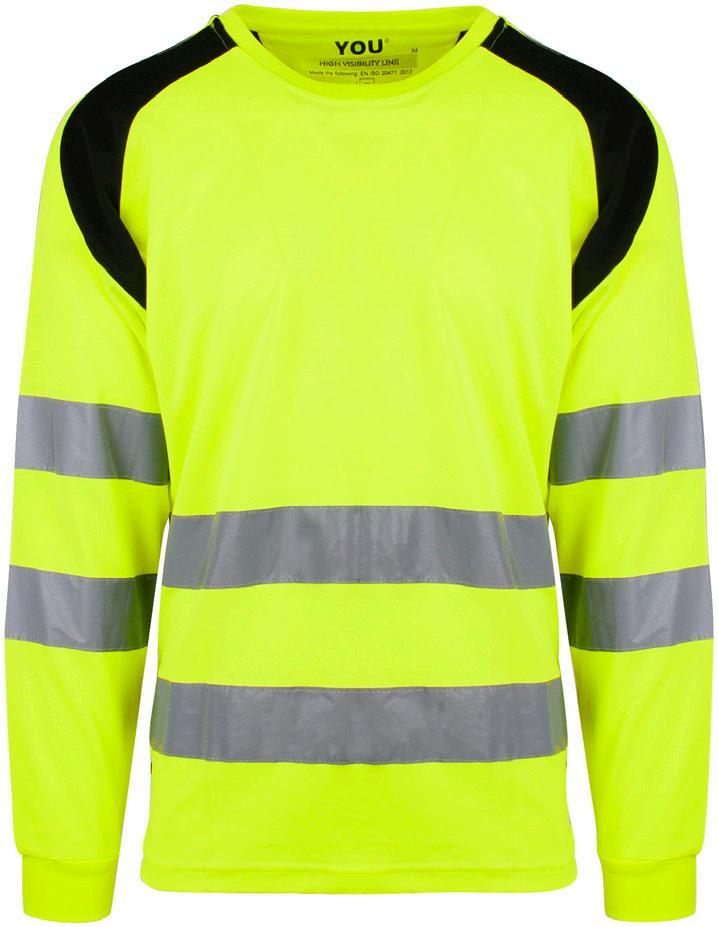 Unisex HI-VI langermet t-skjorte. Elastiske reflekser over skuldre, rundt ermer og midje. Kontrastfarget og elastisk ribb i hals, ermer og liv. CE-merket EN 20471, klasse 2.