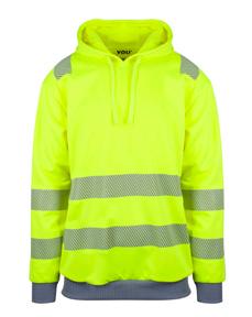 Unisex hettegenser med elastiske reflekser over skuldre, rundt ermer og midje. Kontrastfarget og elastisk ribb i ermer og liv. Flosset innside. CE-merket EN 20471, klasse 2.