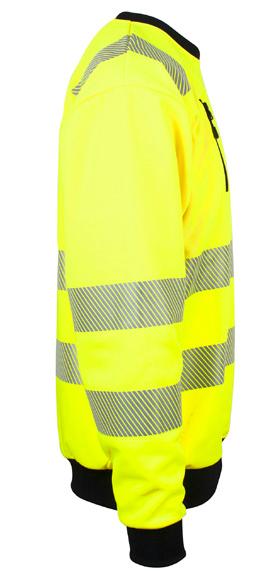 Unisex hi-vi sweatshirt med kontrastfelt og elastisk refleks rundt midje og skuldre. Kontrastfelt i sort over skuldre og sidepanel. CE-merket EN 20471, klasse 2.