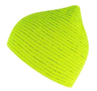Synlighetsbeanie i resirkulert polyestergarn. Lysreflekterende strikket bord på mansjettdesign for høy synlighet. Dobbeltstrikket og sirkulær maskinfinish. Myk og komfortabel.