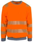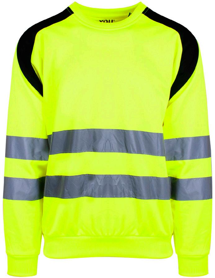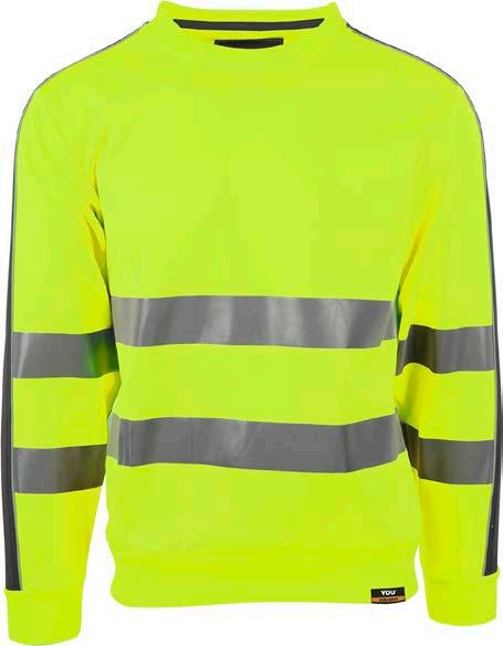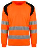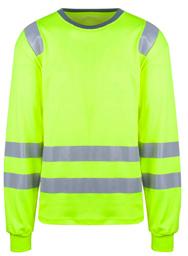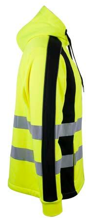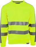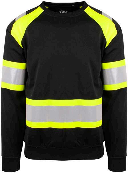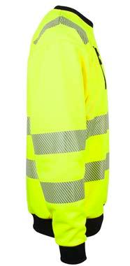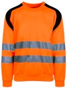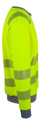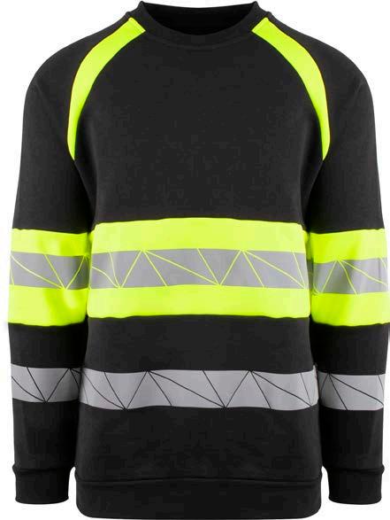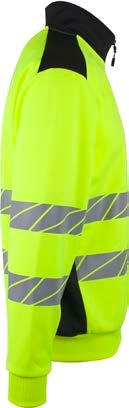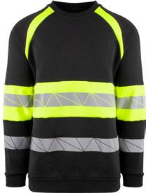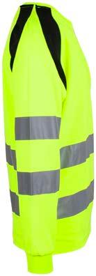 Unisex hi-vi sweatshirt i resirkulert polyester med kontrastfelt og elastisk refleks rundt midje og skuldre. Kontrastfelt i sort over skuldre og sidepanel.
