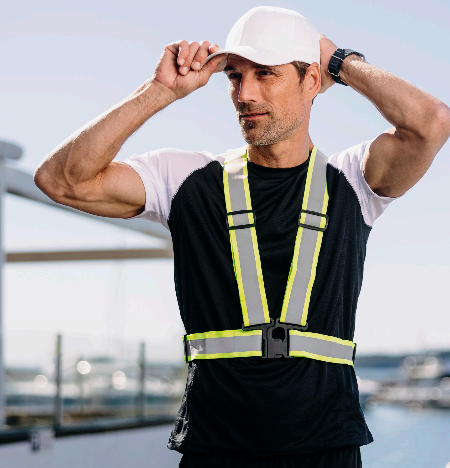 Headover med reflekterende striper. Pustende stoff og sømløs for komfort. Håndvask.