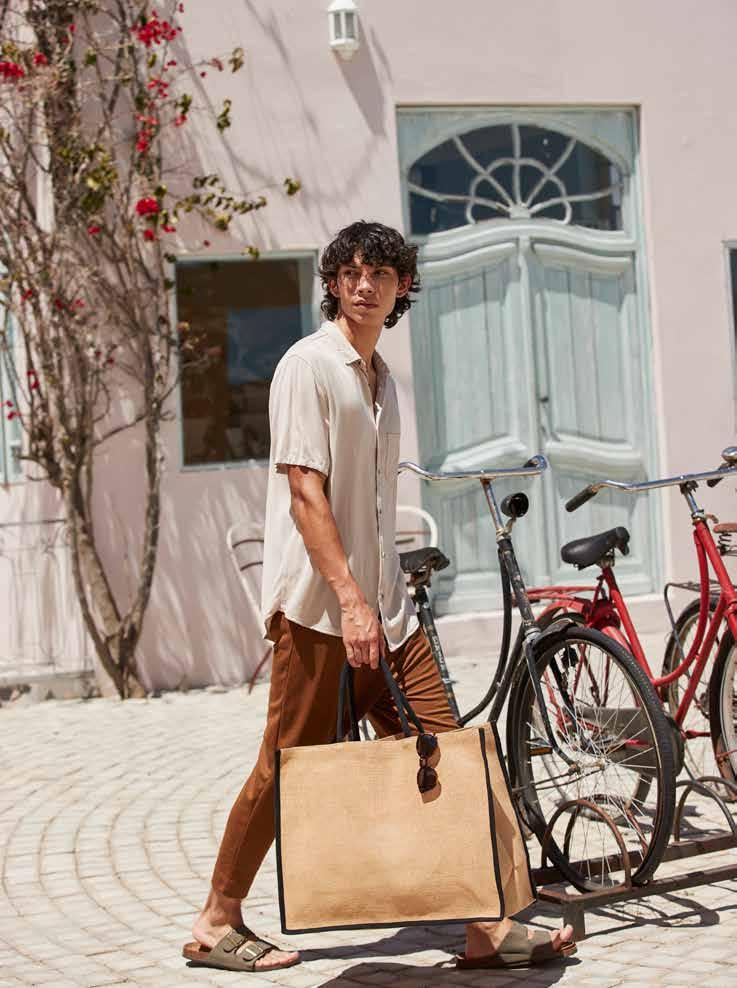 NATURAL STARCHED JUTE MARKET SHOPPER Romslig handlenett i ulaminert stivnet jute med solid bomullshank. Ton-i-ton eller naturfarget med kontrasthåndtak.