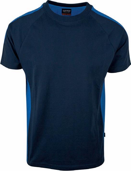 Ekstremt slidstærk unisex PRO t-shirt med kontrastfarve foran skuldrene og øverst på ryggen. Klassisk snit. Tapede sømme og elastan i nakken. Tåler hård industriel vask og tørring. 60 grader.