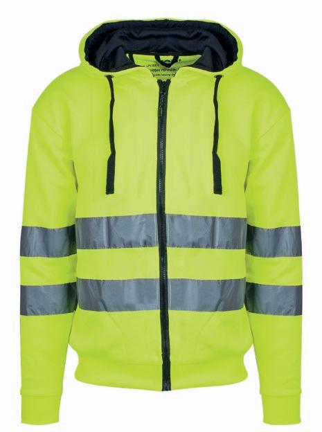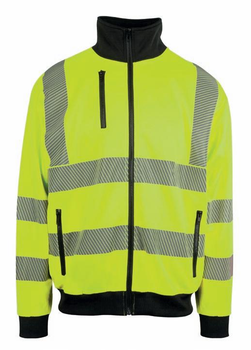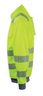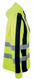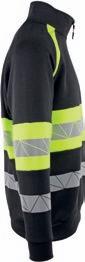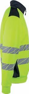 Unisex zipsweat med elastisk refleks på skuldre, ærmer og mave. ¾ lynlås og brystlomme med lynlås. Kontrastrib på ærmer og linning. Multimediaport i lomme. CE-mærket EN 20471, klasse 3.