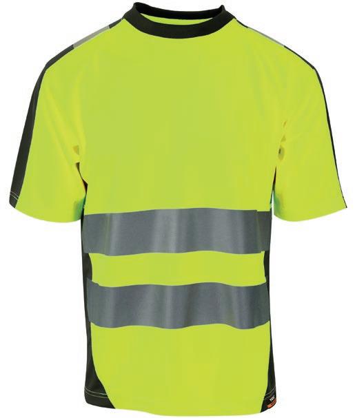 Tofarvet pro-dry behandlet unisex t-shirt med elastiske heat transferreflekser omkring taljen og ærmerne. CE-mærket EN 20471, klasse 1.