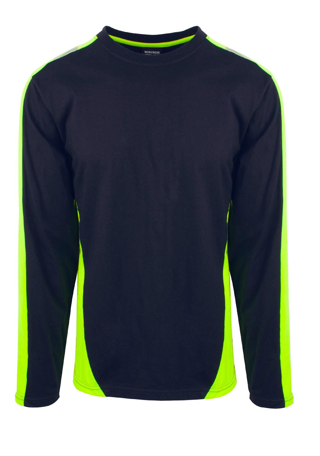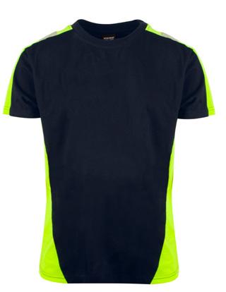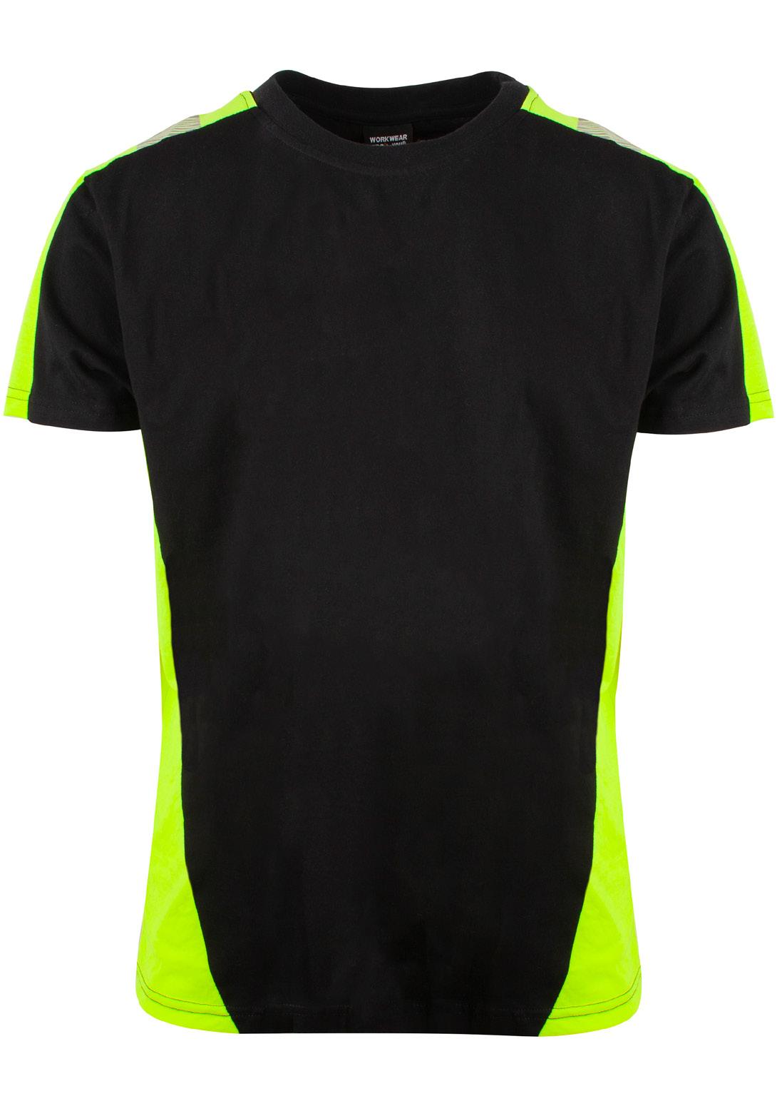 PRO T-shirt i bomuld og 40% recirkuleret polyester. Klassisk snit- og safety gule kontrastfelter i siderne og over skuldrene/ ærmerne. Refleksfelt på hver skulder. Tåler hård industriel vask og tørring (60 grader).