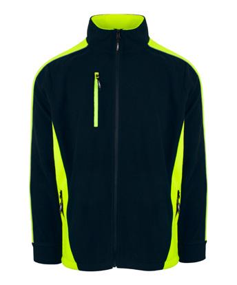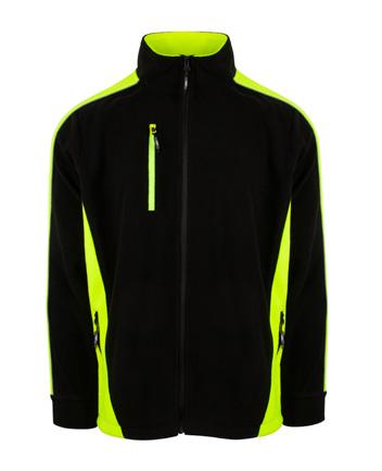 Ekstremt holdbar unisex PRO arbejdsjakke i fleece i 100% genanvendt polyester. Klassiske snit- og safety gule kontrastfelter i siderne og over skuldrene/ ærmerne. Brystlomme og sidelommer med lynlås. Tåler hård industriel vask og tørring. (60 grader) Fleecejakken tilhører en ny kollektion af genanvendt polyester.