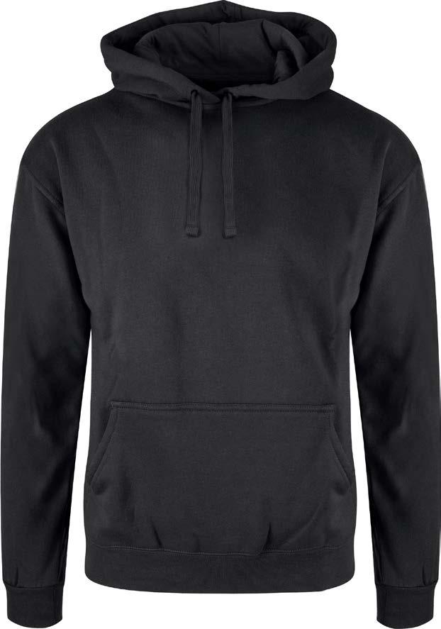 Hættetrøje til herre. Dobbelt jerseystrikket, børstet inderside, forstærkede søm og lycra i alle rib. Snøre i halsen og kængurulomme.