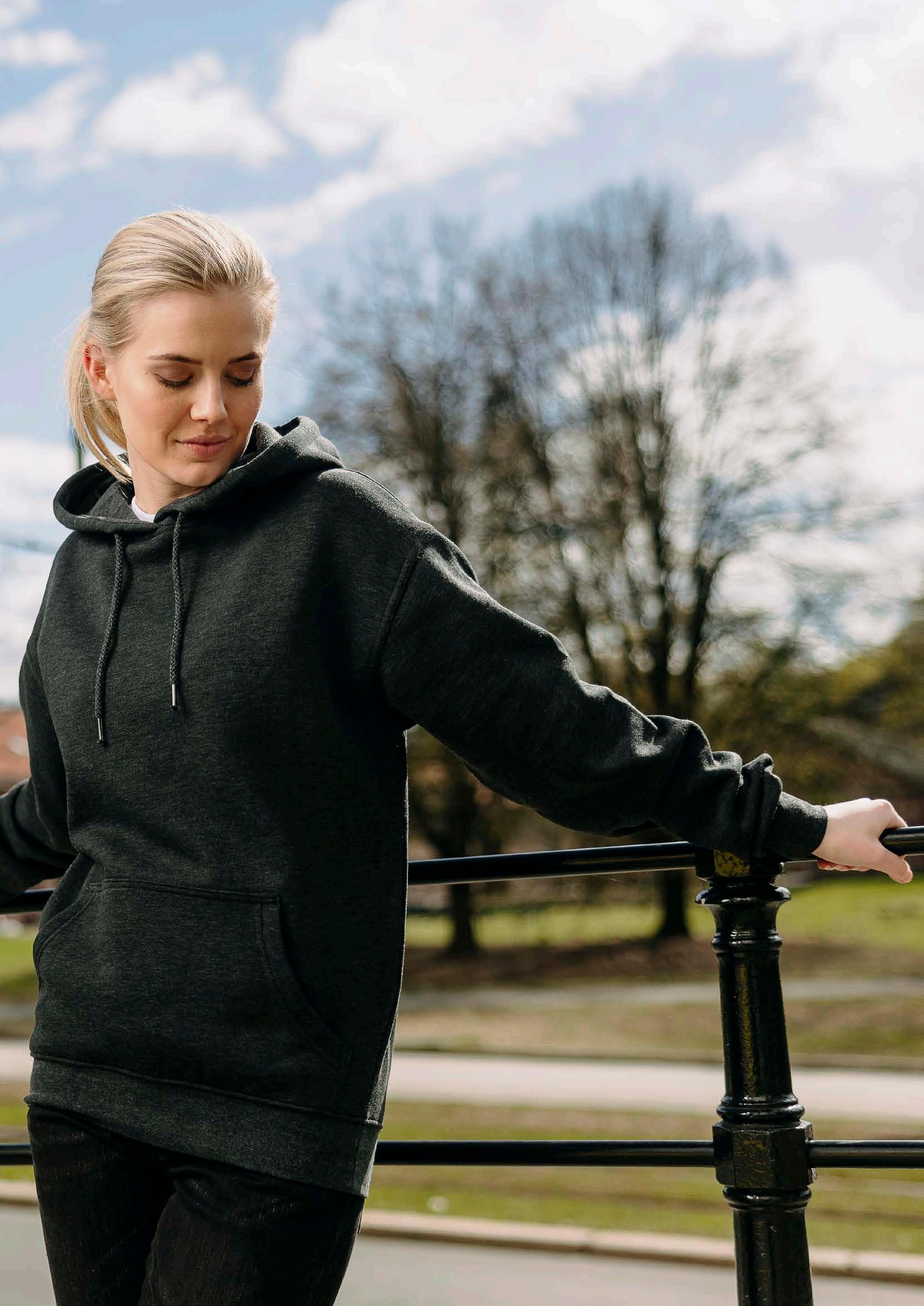 Bestselgende klassisk hættejakke i unisex og til dame. Dobbelt jerseystrikket, lycra i alle ribber og børstet indside. Snøre og foer i hætte. Kængurulomme med mediaport i front.