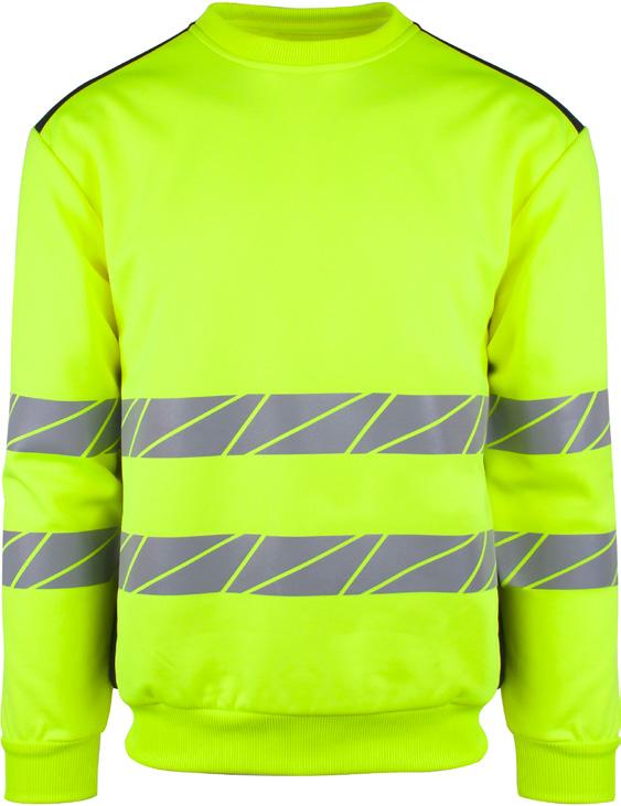 Unisex hi-vi sweatshirt med kontrastfelt og elastisk refleks omkring taljen og skuldrene. Kontrastfelt i sort på skuldre, nakke og sidepanel.