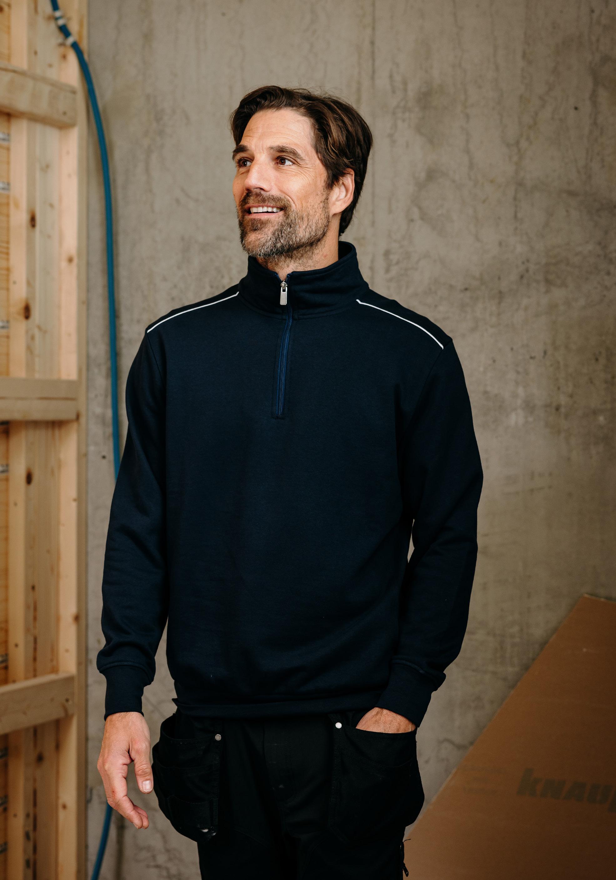Ekstremt holdbar unisex PRO lynlås sweat med kontrastpiping foran på skuldrene og øverst på ryggen. Kontrastfelt over skuldre og sidepanel med tofarvet varianter. Klassisk snit. Ribbede manchetter og linning med elastan. Tåler hård industriel vask og tørring. 60 grader.