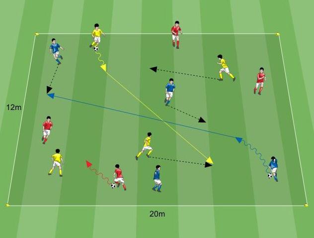Nell’esempio viene riportata una proposta appartenete al Contenitore “Giochi di Possesso”. I giocatori vengono divisi in gruppi da 4 componenti ciascuno. Ogni gruppo è in possesso di un pallone e cerca di mantenerne la disponibilità in condizioni di superiorità 3 contro 1 all’interno dello spazio delimitato. Durante lo svolgimento del gioco è vietata la trasmissione al compagno più vicino al giocatore in possesso palla. In caso di riconquista del pallone da parte del giocatore in inferiorità numerica, così come in caso di uscita della stessa dal terreno di gioco, si effettua un’inversione di ruolo con l’ultimo giocatore che ha toccato palla.