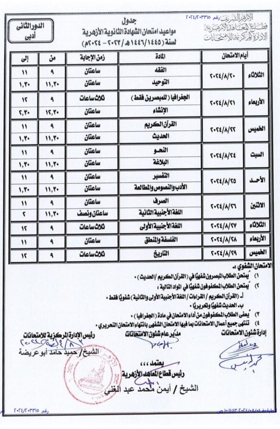 جدول الشهادة الثانوية الأزهرية بقسميه المعتمد دور ٢ . ٢٠٢٤
