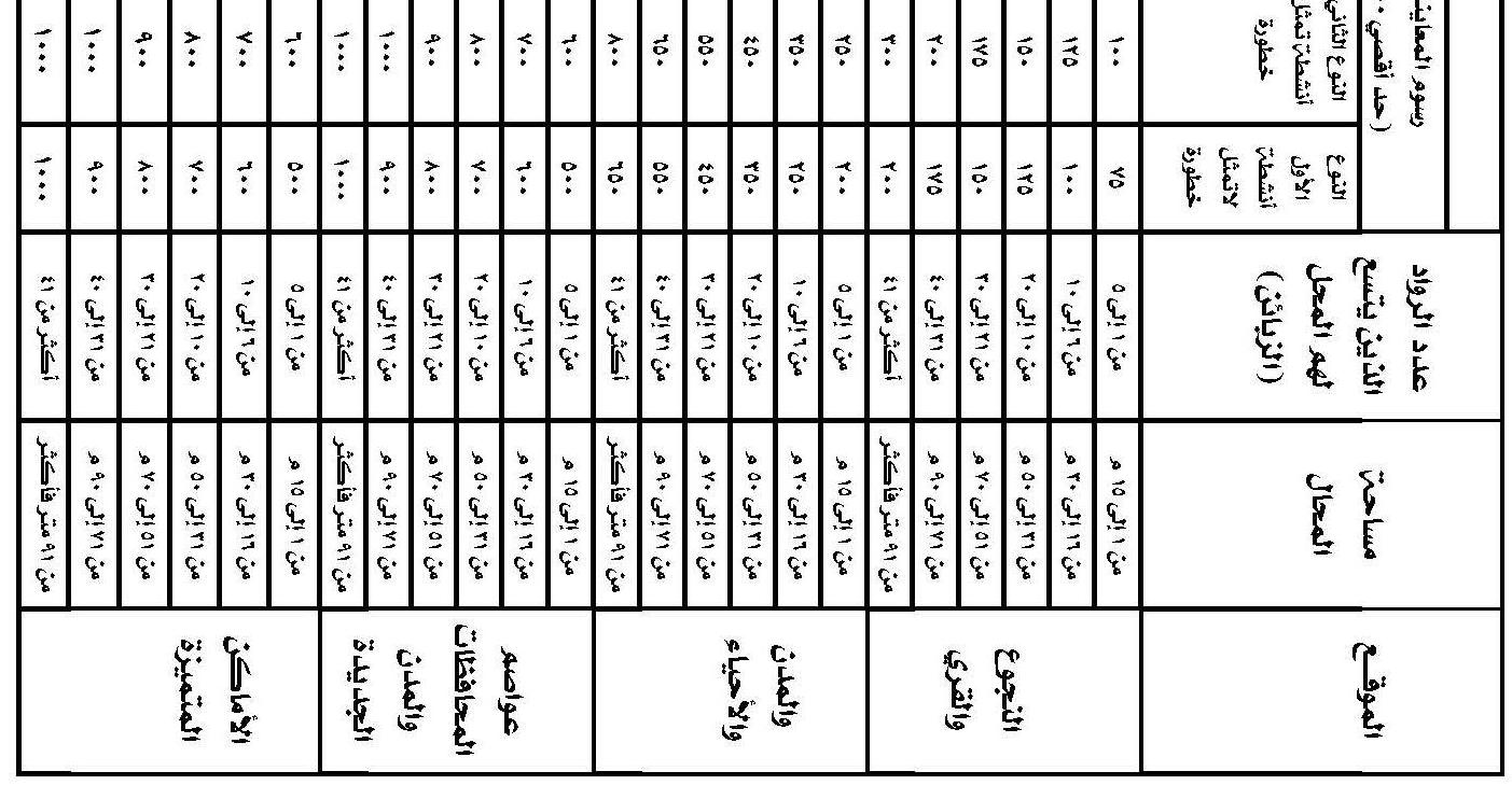 ﺔﺤﺎﺴﻤ لﻘﺘ ﻻﺃ ٥٠ ٪ ﺭﺠﻟﺍ ﺔﺤﺎﺴﻤ ﻥﻤ ﺝﺍ ٣- ﺔﻓﻭﺸﻜﻤﻟﺍ ﺀﺍﺯﺠﻷﺎﺒ ﺕﺍﺭﺎﻴﺴﻟﺍ ﺕﻴﺒﻤ ﻯﺭﺠﻴ ﻻﺃ . ٤- ﻥﻋ ﻥﻜﺎﺴﻤﻟﺍﻭ ﺝﺍﺭﺠﻟﺍ ﻥﻴﺒ ﺔﻓﺎﺴﻤﻟﺍ لﻘﺘ ﻻﺃ ٥ ﻥﻤ لﻗﺃ ﻪﺘﺤﺎﺴﻤ ﺕﻨﺎﻜ ﺍﺫﺇ ﺭﺎﺘﻤﺃ ٢٥٠ ٢ﻡ ، ١٠ ﻥﻋ ﻪﺘﺤﺎﺴﻤ ﺕﺩﺍﺯ ﺍﺫﺇ ﺭﺎﺘﻤﺃ ٢٥٠ ٢ﻡ ، ١٥ ﺕﺩﺍﺯ ﺍﺫﺇ ﺍﺭﺘﻤ ﻥﻋ ﻪﺘﺤﺎﺴﻤ ٥٠٠ ٢ﻡ . - ﺔﻓﻭﺸﻜﻤﻟﺍ ﺕﺎﺠﺍﺭﺠﻟﺍ ﻲﻓ ﺭﻓﺍﻭﺘﺘ ﻥﺃ ﺏﺠﻴ ١- ﺝﺍﺭﺠﻟﺍ ﻊﻗﻭﻤ ﻥﻭﻜﻴ ﻥﻴﺒ ﺔﻴﺘﻵﺍ ﺕﺎﻓﺎﺴﻤﻟﺍ ﺭﻴﻓﻭﺘ ﻊﻤ ،ﻲﻨﺍﺭﻤﻌﻟﺍ ﻁﻴﻁﺨﺘﻠﻟ ﺎﻘﺒﻁ ﻥﻜﺎﺴﻤﻟﺍﻭ ﺝﺍﺭﺠﻟﺍ : ﺃ( ١٠ ﺔﺤﺎﺴﻤﻟﺍ ﺕﺍﺫ ﺕﺎﺠﺍﺭﺠﻠﻟ ﺭﺎﺘﻤﺃ ٥٠٠ ٢ﻡ