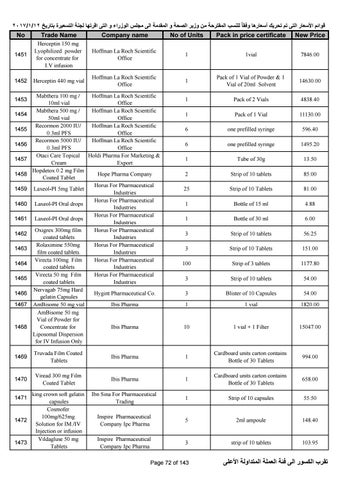 2017/1/12 قوائم األسعار التى تم تحريك أسعارها وفقا ً للنسب المقترحة من وزير الصحة و المقدمة الى مجلس الوزراء و التى اقرتها لجنة التسعيرة بتاريخ No Trade Name Company name No of Units Pack in price certificate New Price 1451