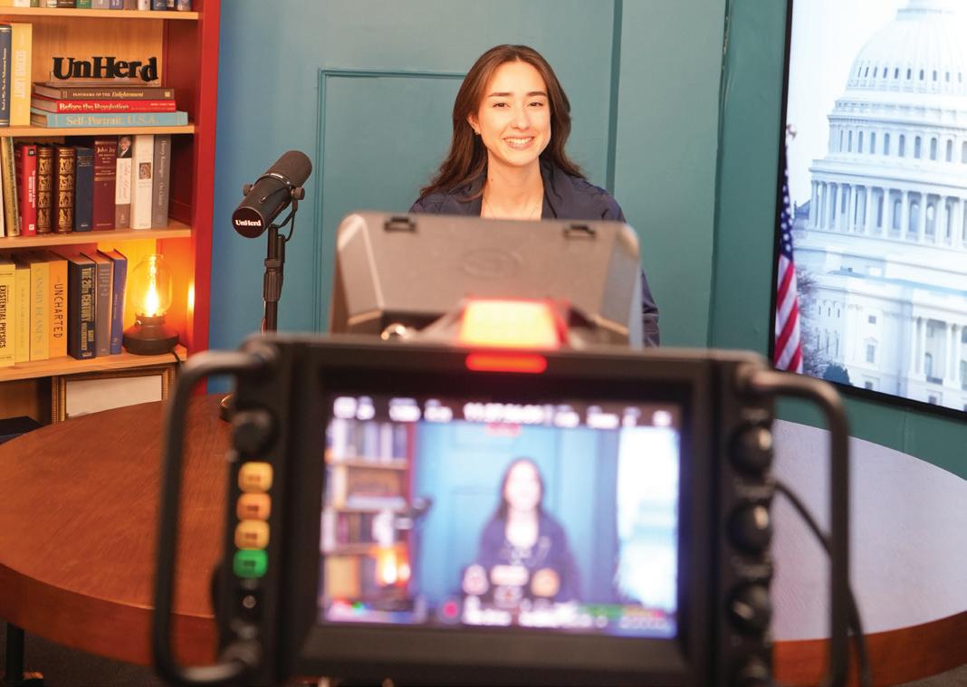 University of Dallas student Barbara Najera practices her broadcasting skills during her National Journalism Center internship with UnHerd, a rapidly growing digital news outlet.
