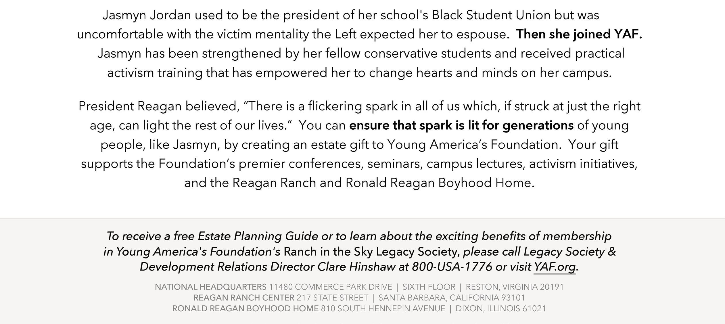 “When you consider that Nancy Reagan entrusted YAF with Rancho del Cielo, you can trust that your planned gift to YAF will be well taken care of.”