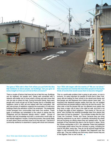 This is a world-wide problem that is going to get worse; no one is immune. It’s quite important for people to know that in New York, many still are waiting for their homes to be rebuilt post-Sandy and that people are still displaced from Katrina eleven years later. It’s important that displaced people realize that they are not isolated and that there are people willing to help from all over the world. The other side is that the people that are not affected must realize that they have a major role to play in the relief as well, and that is not to forget the plight of their neighbors. That mantra of “We are not alone” also includes the existing knowledge base from places that have been hit hard by disasters. This includes locales like the Gulf Coast, the Carolinas, Florida, and Texas, because they can bring planning experience so we aren’t constantly reinventing the wheel and are focusing our efforts where they are needed most. The last example of how important this idea is can be found in Japan. Since the Tohoku earthquake in 2011, the Japanese Times has published a front-page article about how the recovery is going, including the cost for the effort, every day. They do not let anyone forget that the region is still recovering from a disaster that happened over five years ago. They are making sure that every citizen knows they are in this together, that no one is alone. ■