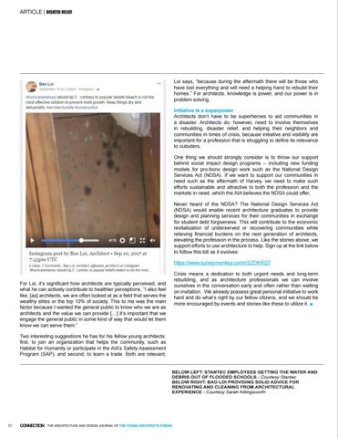 Two interesting suggestions he has for his fellow young architects: first, to join an organization that helps the community, such as Habitat for Humanity or participate in the AIA’s Safety Assessment Program (SAP); and second, to learn a trade. Both are relevant, BELOW LEFT: STANTEC EMPLOYEES GETTING THE WATER AND DEBRIS OUT OF FLOODED SCHOOLS - Courtesy Stantec BELOW RIGHT: BAO LOI PROVIDING SOLID ADVICE FOR RENOVATING AND CLEANING FROM ARCHITECTURAL EXPERIENCE - Courtesy Sarah Killingsworth