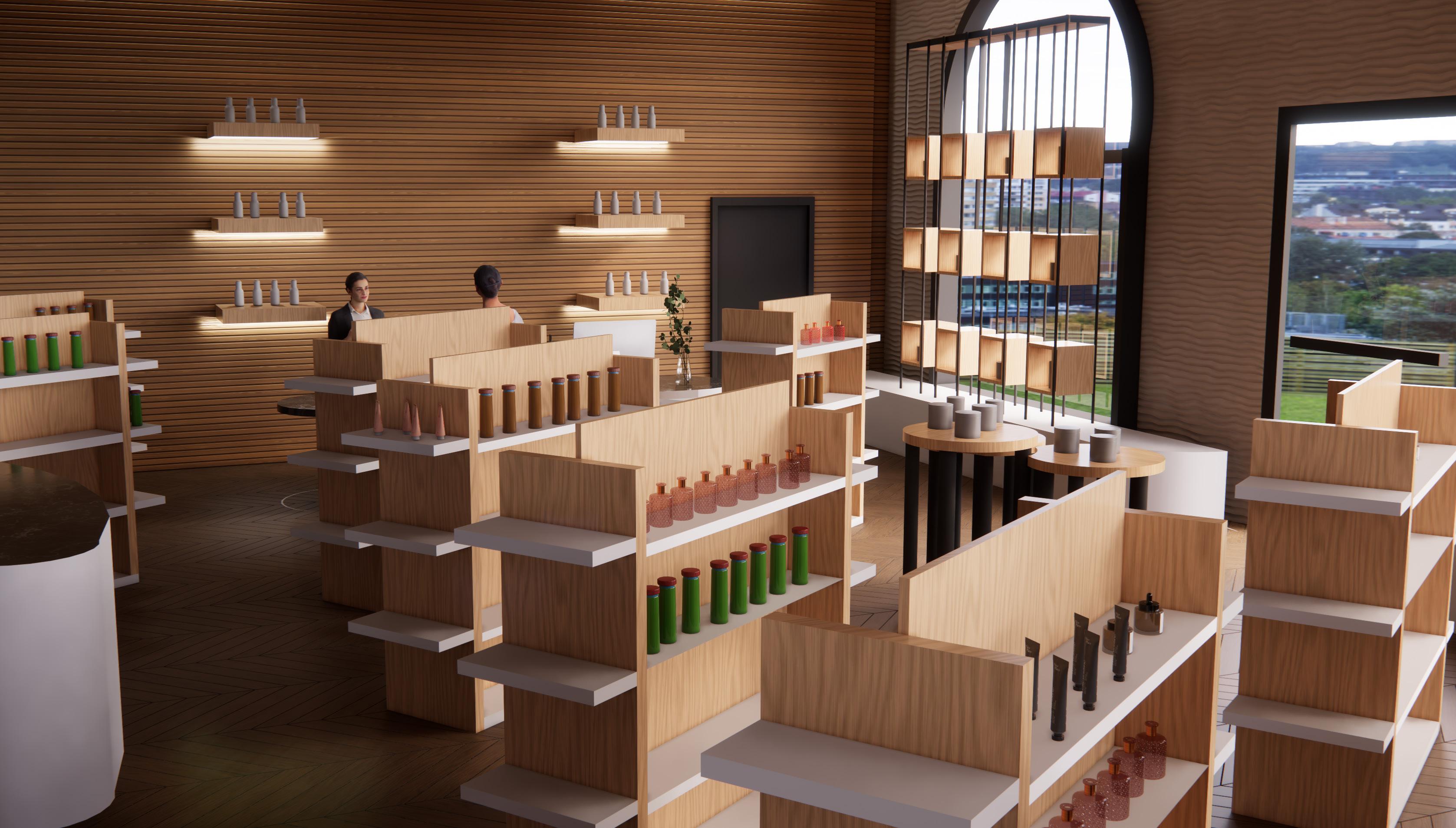 The store’s overall design is meant to deliver a sense of calmness and tranquility, using soft color tones, biophilia, and natural materials.