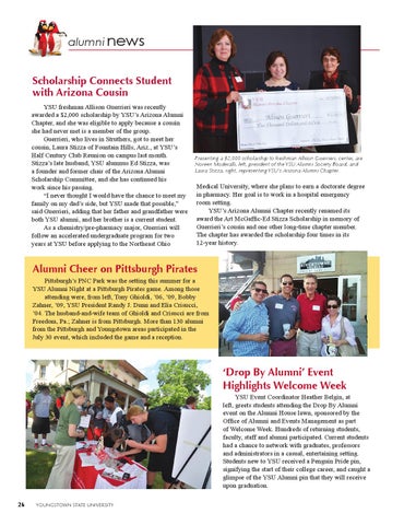 ‘Drop By Alumni’ Event Highlights Welcome Week YSU Event Coordinator Heather Belgin, at left, greets students attending the Drop By Alumni event on the Alumni House lawn, sponsored by the Office of Alumni and Events Management as part of Welcome Week. Hundreds of returning students, faculty, staff and alumni participated. Current students had a chance to network with graduates, professors and administrators in a casual, entertaining setting. Students new to YSU received a Penguin Pride pin, signifying the start of their college career, and caught a glimpse of the YSU Alumni pin that they will receive upon graduation. 26
