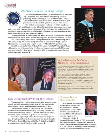 Early College Ranked With Top High Schools Youngstown Early College, a partnership of the Youngstown city schools and YSU, was ranked among the area’s best high schools under the state’s newly developed Ohio School Report Cards. The high school, housed in Fedor Hall on the YSU campus, was ranked with seven other top-scoring Mahoning, Trumbull and Columbiana county high schools – Canfield, Poland, South Range, Western Reserve, Champion, Maplewood and McDonald. YEC offers regular high school classes for students in grades nine through 12, and upper class students may also enroll in regular YSU college classes. More than half of the 47 students in the 2013 graduating class earned 50 college credits or more.