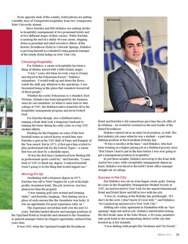 From opposite ends of the country, hotel patrons are getting a healthy dose of Youngstown hospitality from two Youngstown State University alumni. Steve Bartolin and Bill Mehalco are making strides in hospitality management at two prominent hotels and at two different stages of their careers. While Bartolin is nearing the end of a stellar 40-year career, stepping down as president and chief executive officer of the historic Broadmoor Hotel in Colorado Springs, Mehalco is proving himself as a talented young general manager of the trendy Hotel Indigo in New York City. Choosing Hospitality For Mehalco, a career in hospitality has been a thing of destiny mixed with a little Disney magic. “I was 7 years old when we took a trip to Disney and stayed at the Polynesian Resort,” Mehalco remembers. “I would walk up and down the floors, watch the staff, pay attention to the operations. I was fascinated being in this place that somehow housed all of these people.” Whether the exotic Polynesian or a standard. Best Western, Mehalco has been intrigued by the business since he can remember. So when it came time to start college at YSU, the Hubbard native found his fit in the hospitality management program and never looked back. For Bartolin though, also a Hubbard native, running a front desk took a temporary backseat to running the bases during his early years as a top YSU student-athlete. Pitching for the Penguins on some of the best baseball teams in school history would later earn Bartolin a spot in the YSU Hall of Fame and Penguin of the Year award. But in 1972, it first gave him a ticket to play professional ball for the Detroit Tigers—a career that was cut short by a shoulder injury. “It was the first time I understood how fleeting life in professional sports could be,” said Bartolin. “I came back to YSU to finish my degree; I realized baseball wasn’t going to be the thing that would support me.” Moving On Up Graduating with a business degree in 1975, Bartolin was off to West Virginia for a job at the highprofile Greenbrier hotel. The job, however, was less glamorous than the property. “I was running golf carts around and cleaning clubs,” said Bartolin, laughing. “But starting out in a place of such renown like the Greenbrier was lucky. It was an opportunity for great experience early on.” The experience served him well over the next 12 years. Bartolin landed director and manager positions at the Opryland Hotel in Nashville and returned to the Greenbrier as general manager before his biggest opportunity surfaced four years later. It was 1991 when the Opryland bought the Broadmoor