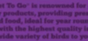 Suet To Go® is renowned for producing Suet To Go® is is renowned d for or p high quality products, providing premium high high quality p h products, pro ing p viding prem energy wild bird food, ideal for year round feeding. energy wild bird erg d food, idi ea al fo or year roun Our food is made with the highest quality ingredients Our food is made with the highest quality inod with the highest t and is sure to attract a wide ariety of birds to our garden. and is sure to att to ract a wide ariety of birds to y of birds to ou