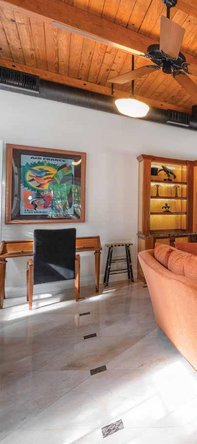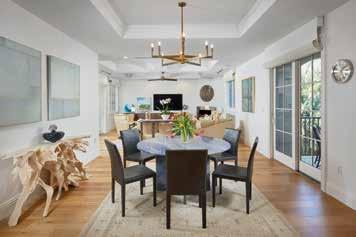 With its larger-than-life custom wall mural, entitled Snowy Egret, by Hovia, of England (Realtor Chris Well’s favorite feature in the home) and contemporary, nature-inspired dining table this room brings a simple elegance to dinner and socializing. Double doors lead into the spacious dining room, designed with a neutral palette to emphasize the beautiful art. The room is furnished with an elongated natural wood table and seating for eight and a buffet for easy serving and extra storage. An expansive, contemporary window brings in the light and previews the tropical outdoor greenery outside. A white coffered ceiling and unique floating lighting fixture add to the space’s striking look.