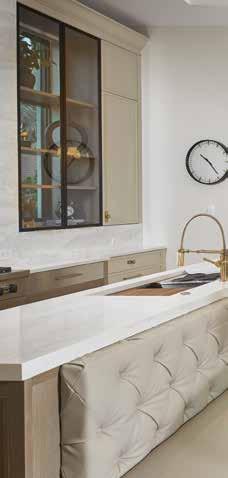 Superb place to meet for a meal and lively conversation, the kitchen’s custom cabinets, by Marcus Jelly, LLC in England, have been painted in Smokey Taupe by Benjamin Moore. This beautiful tone is in keeping with the move away from all white kitchens as people look for more color and variety in this space. Marble countertops top a unique island that features a leatherette banquette that offers a special degree of functionality to the kitchen. High-end appliances like a Sub-Zero Fridge/Freezer and icemaker, dual-fuel Wolf gas stove and microwave drawer, and two Sub-Zero wine coolers, make cooking and entertaining easy. The upscale, contemporary lighting, which always draws rave reviews, is from Hinkley Lighting. The black and white theme of the lighting is complemented by gold accents like luxe gold faucets.
