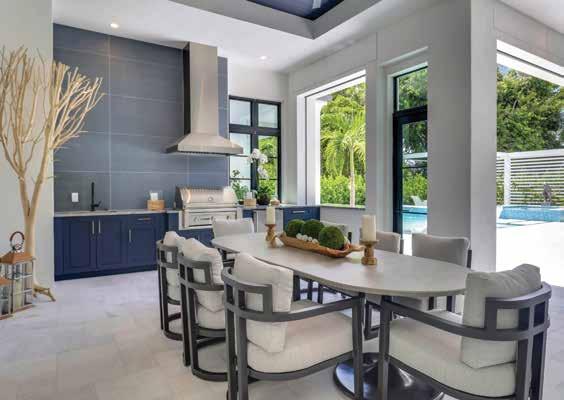 Blurring the line between indoor elegance and alfresco living, the outdoor kitchen and dining area invite relaxation with style. Navy cabinetry and sleek stainless accents lend a polished coastal vibe, while cushioned dining chairs and soft neutral tones ensure comfort under the open sky. Overlooking the pool and lush greenery, this space is designed for effortless entertaining — from casual family barbecues to evening gatherings surrounded by warm Florida breezes.